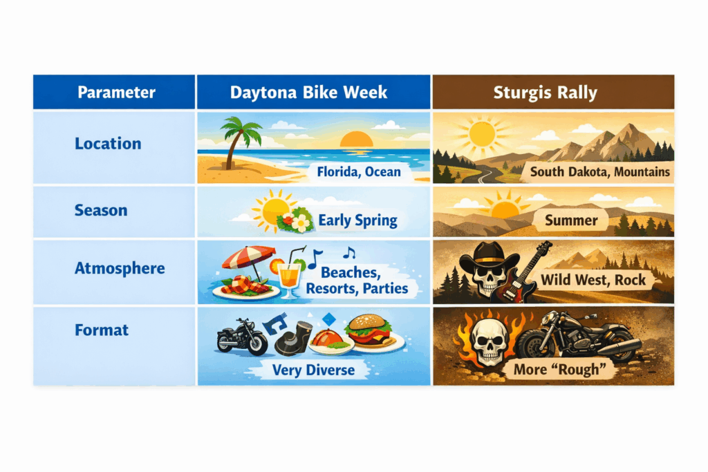 Daytona Bike Week is often compared to another large-scale motorcycle event — the Sturgis Motorcycle Rally. While both festivals are deeply rooted in motorcycle culture, they differ significantly in atmosphere, audience, and overall experience.