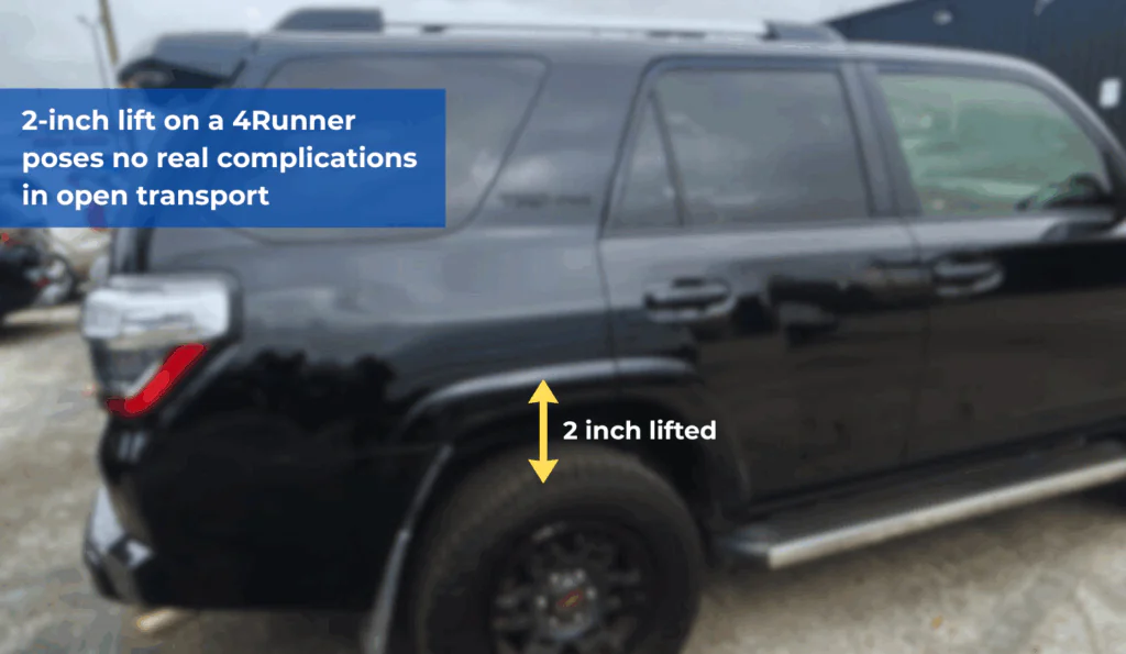 A 2-inch lift on a 4Runner poses no real complications in open transport. The standard clearance on this model of 4Runner is already close to 9 inches, so a 2-inch lift only puts the vehicle within a normal range of loading capacity. Carrier companies rarely complain about a mild lift kit on a vehicle already so tall.